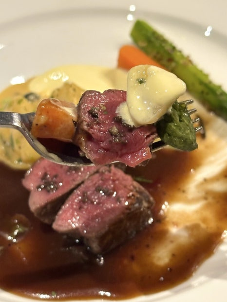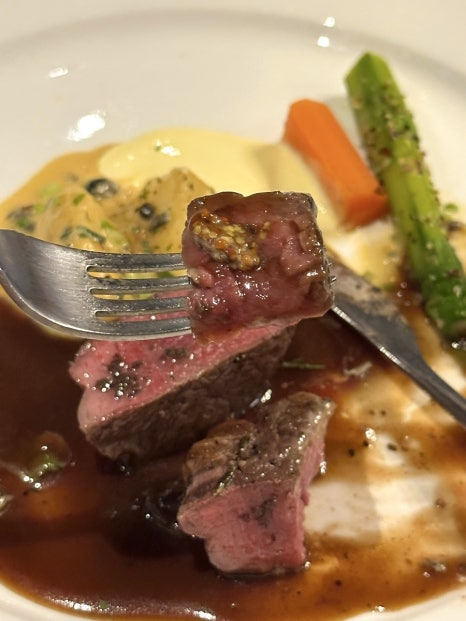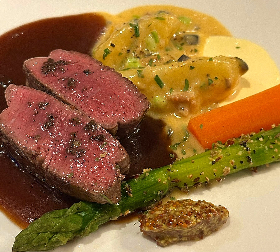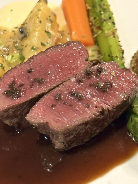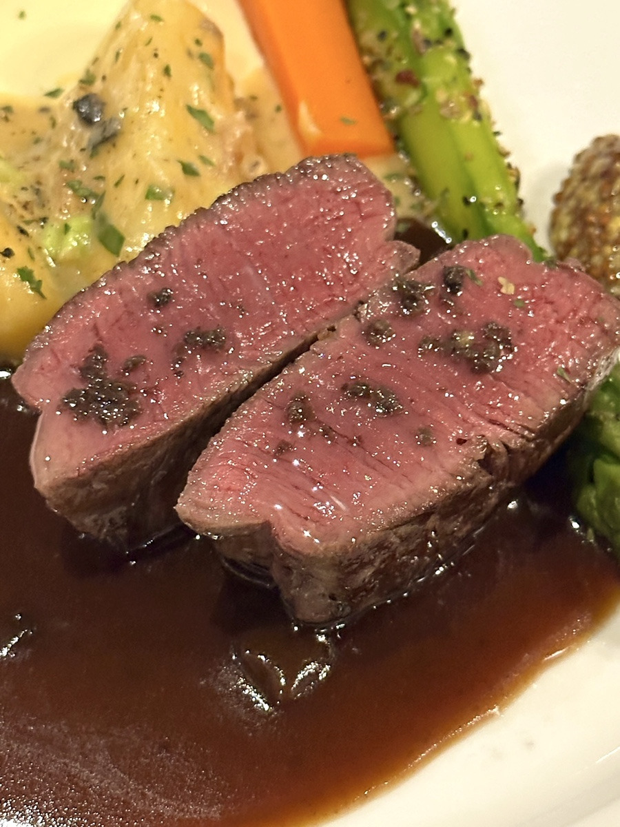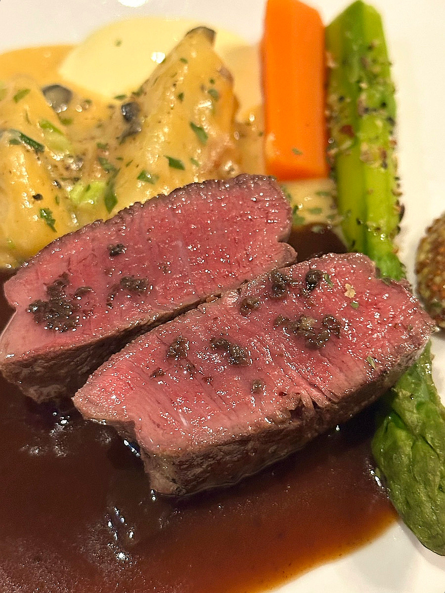 미디엄 레어로 구워진 소안심은 육즙이 가득하며 깊은 풍미의
