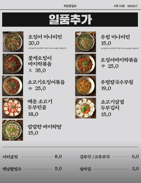 들깨미역, 소고기삼겹 우렁 오징어 표고버섯 꽃게 스지 바지락까지
