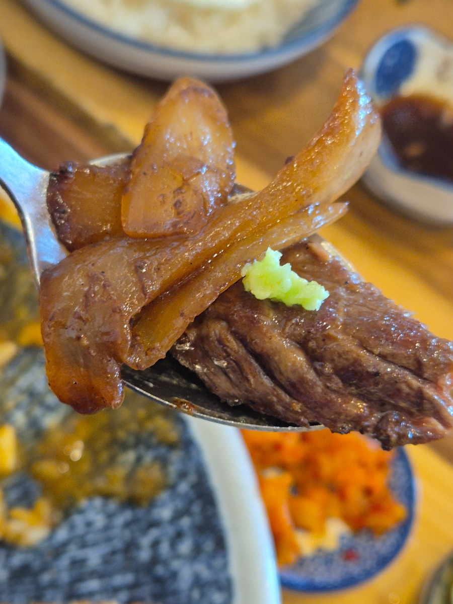 달달한 양파볶음 위에 살치스테이크가